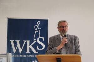 „Herzlich willkommen an der Wilhelm-Knapp-Schule, so begrüße ich immer die etwa 400 neuen Schüler, die jährlich zu uns kommen“, sagte Schulleiterin Ulla Carina Reitz. Sie dankte nicht nur Christopher Schenk vom HessenCampus für sein großes Engagement bei der Ausrichtung der Bildungsmesse, sondern auch ihren zahlreichen Kollegen, die rund um Fragen der Aus- und Weiterbildung zur Verfügung stünden. Seit der letzten Messe 2019 sei viel passiert. „Der Fachkräftemangel ist zum Arbeitskräftemangel geworden, die Geschäfte reduzieren deshalb teilweise ihre Öffnungszeiten und es gibt einen großen Mangel an Handwerkern“, sagte die Schulleiterin. Bei der Bildungsmesse ließen sich alle Ausbildungsarten finden, die es in Deutschland gibt. Das einzige Hab und Gut seien Bildung und Ausbildung, das könne einem niemand mehr wegnehmen. 2021 sei eine Messe in Planung gewesen, aber da sei die Inzidenz zu hoch gewesen. „Wir mussten die Messe schweren Herzens absagen“, meinte Michael Schneider, Sprecher des HessenCampus.